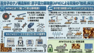 高分子化学【高分子化学】ナノの世界を「指先」で触る!AFM(原子間力顕微鏡)の原理と表面観察 ナノの世界を触って視る「AFM(原子間力顕微鏡)」の測定原理と高分子観察への応用を徹底解説!光てこ方式の仕組みから、柔らかいサンプルに必須のタッピングモード、硬さを見分ける位相イメージングまで、材料開発に欠かせない知識を網羅しています。 2026.04.25高分子化学