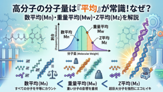 高分子化学【大学化学】高分子の「分子量」を完全攻略!数平均・重量平均の違いと計算式を徹底解説 高分子(ポリマー)になぜ複数の「平均分子量」が存在するのか疑問に思っていませんか?本記事では、数平均分子量(Mn)、重量平均分子量(Mw)、Z平均分子量(Mz)の違いや計算式、分散度の意味を分かりやすく解説。テストやレポート対策に役立つ具体的な例題も紹介しています! 2026.04.01高分子化学