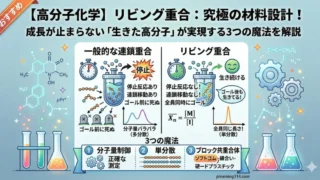 高分子化学に革命をもたらした「リビング重合」を徹底解説!停止反応や連鎖移動がなく成長し続ける「生きた高分子」の仕組みから、分子量の精密制御、単分散、ブロック共重合体の合成といった3つのメリット、最新のリビングラジカル重合まで、究極の材料設計メカニズムがスッキリ学べます。