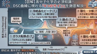 高分子化学【高分子化学】高分子の分析方法を総まとめ!分子量・構造・熱物性を測る機器分析 高分子の正体と実力を暴く!プラスチックの分析方法(機器分析)を目的別に分かりやすく総まとめ。GPCによる分子量測定から、NMR・FT-IRでの構造解析、DSC・TGAによる熱物性、引張試験などの力学物性まで、研究やテストで必須の知識を網羅しています。 2026.04.16高分子化学