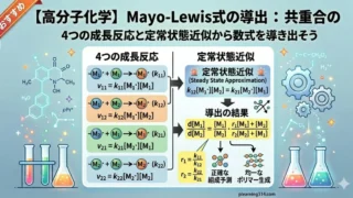 高分子化学【高分子化学】Mayo-Lewis式(共重合組成式)の導出を世界一わかりやすく解説! 高分子化学で頻出の「Mayo-Lewis式(共重合組成式)」の導出を分かりやすく解説!複雑に見える数式も、4つの成長反応と「定常状態近似」を使った証明の手順をステップバイステップで紐解けばスッキリ理解できます。丸暗記に頼らないテスト対策の決定版です。 2026.04.11高分子化学