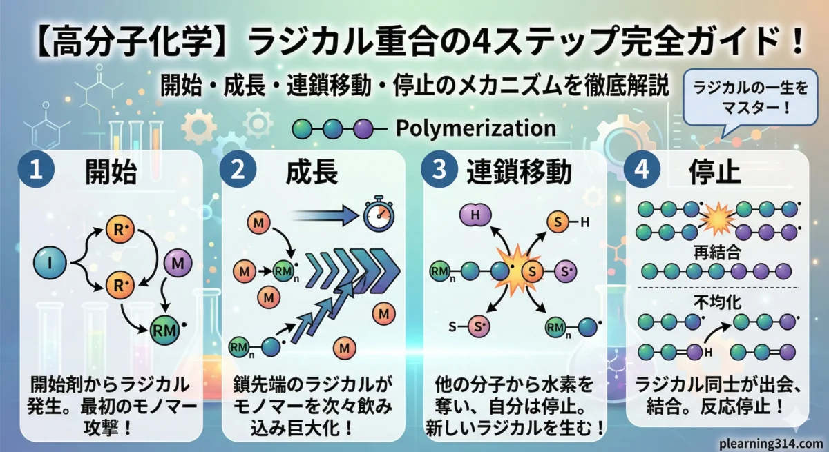 今回は、このラジカル重合のメカニズムを「開始」「成長」「連鎖移動」「停止」の4つのステップに分けて、分かりやすく徹底解説します!