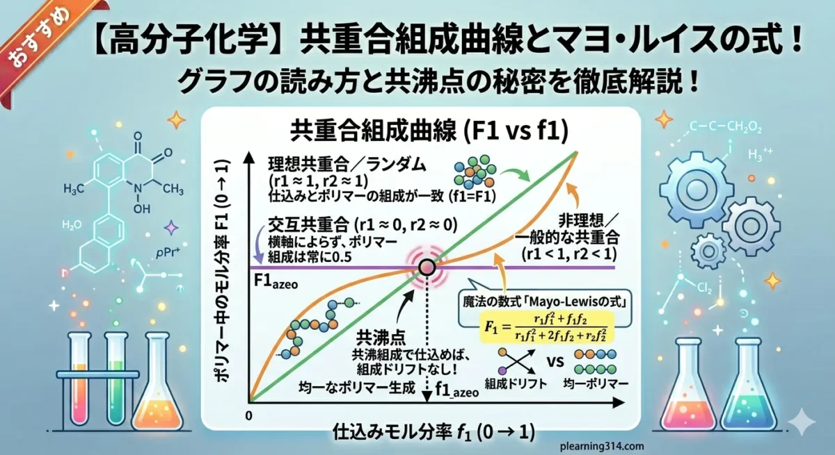 数式やグラフが出てくると難しく感じますが、「自分ならどうやって狙ったプラスチックを工場で作るだろうか?」と技術者の目線に立つと、Mayo-Lewis式や共沸点のありがたみがよく分かりますよ!