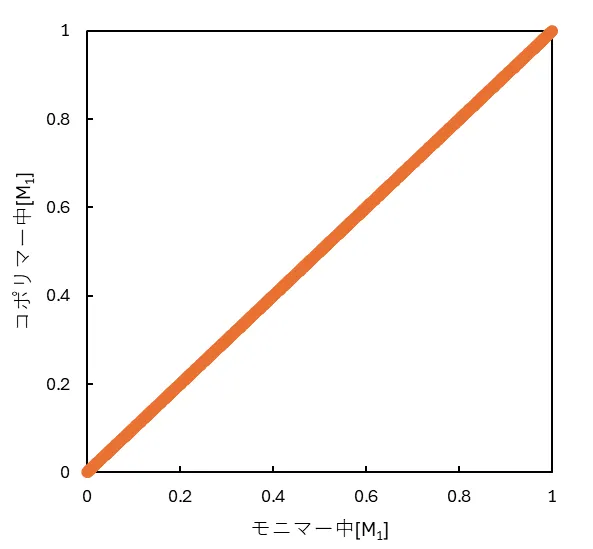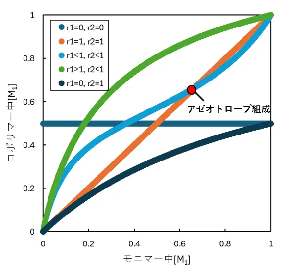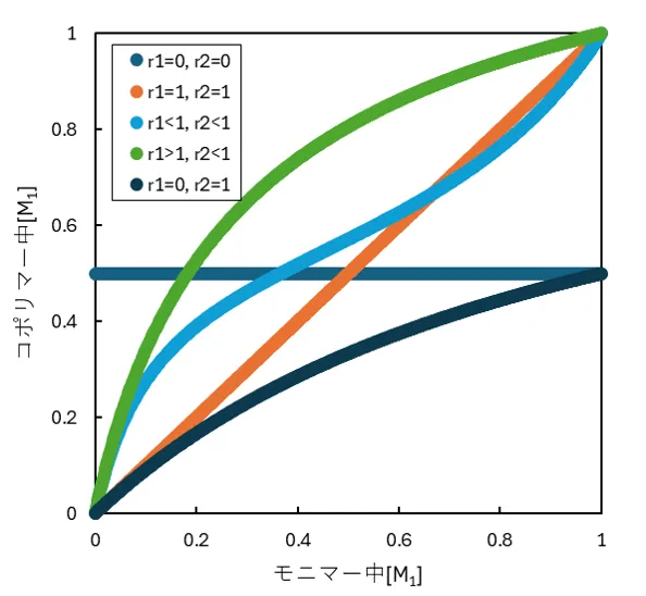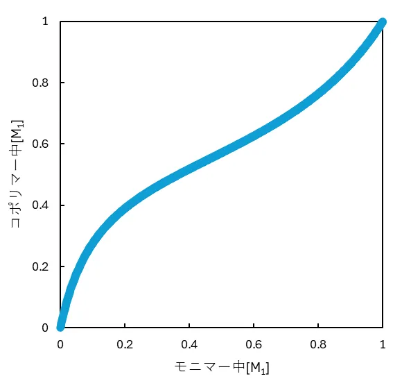 つまり、共重合組成曲線とは「〇〇%の割合でモノマーを混ぜたら(横軸)、△△%の割合で組み込まれたポリマーができた(縦軸)」という関係を可視化したグラフです。