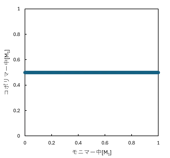 この場合、あなたがフラスコに $M_1$ を10%しか入れなくても、90%入れても、できあがるポリマーは必ず「-1-2-1-2-1-2-」と交互に繋がるため、$M_1$ の割合は常に「50%($F_1 = 0.5$)」になります。