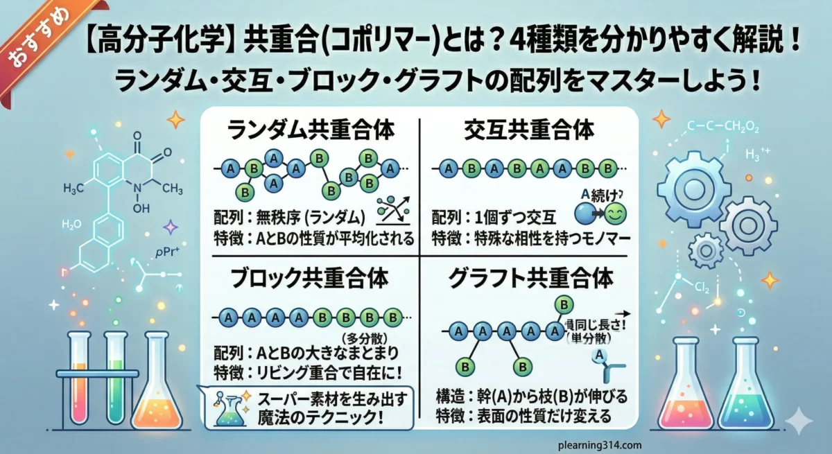 【高分子化学】共重合(コポリマー)とは?ランダム・交互・ブロック・グラフトの4種類を分かりやすく解説!