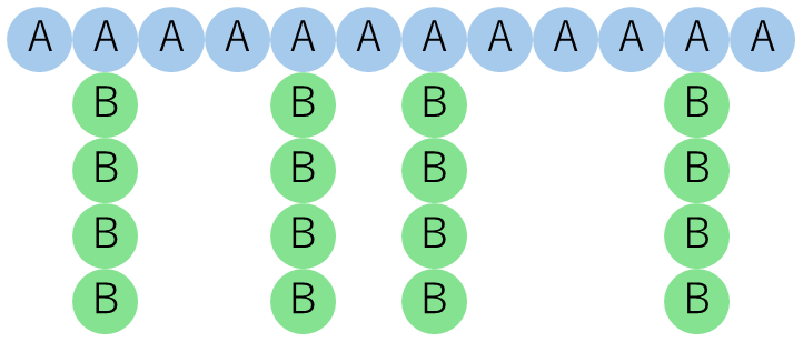 Aが連続して繋がった「ブロック」と、Bが連続して繋がった「ブロック」が、大きく結合した共重合体です。