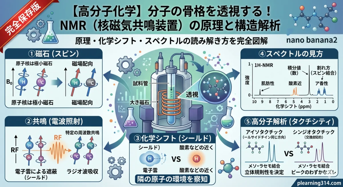 高分子の正体を知る上で、最も情報量が多く、絶対に欠かせない分析機器がNMR(核磁気共鳴装置)です。病院にあるMRI(磁気共鳴画像装置)と同じ原理を使って、目に見えない分子の世界の「原子の並び方」を完璧に透視してしまう魔法のような装置です。