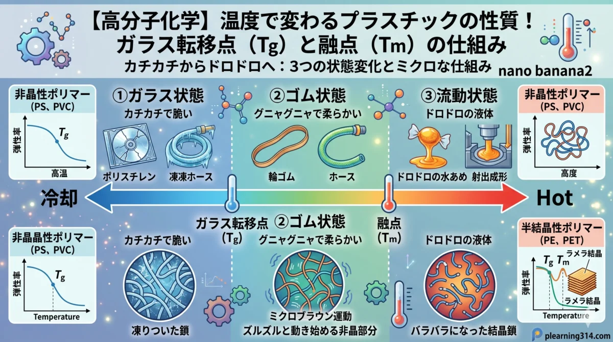 プラスチック(高分子)は、温度によってその姿と性質を劇的に変える「温度の魔術師」です。この温度による変化を理解するための最重要キーワードが、「ガラス転移点($T_g$)」と「融点($T_m$)」です。