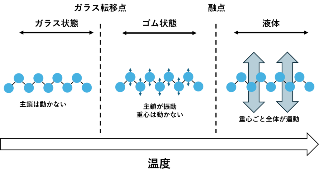 高分子の鎖は、温度(熱エネルギー)を与えられると動き出そうとします。しかし、小さな分子(水など)が「氷(固体)→水(液体)→水蒸気(気体)」とシンプルに変化するのに対し、巨大な高分子はもっと複雑で面白い変化をたどります。