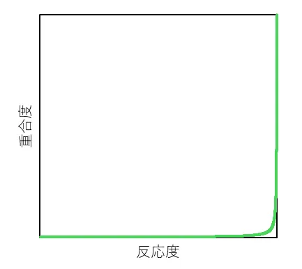 そのため、反応率が80%や90%の時点では、まだ短い鎖(オリゴマー)がたくさん泳いでいるだけの状態です。最後の最後(99%以上)になってようやく、長い鎖同士が結合して巨大な高分子が完成するため、このような大器晩成型のグラフになります。
