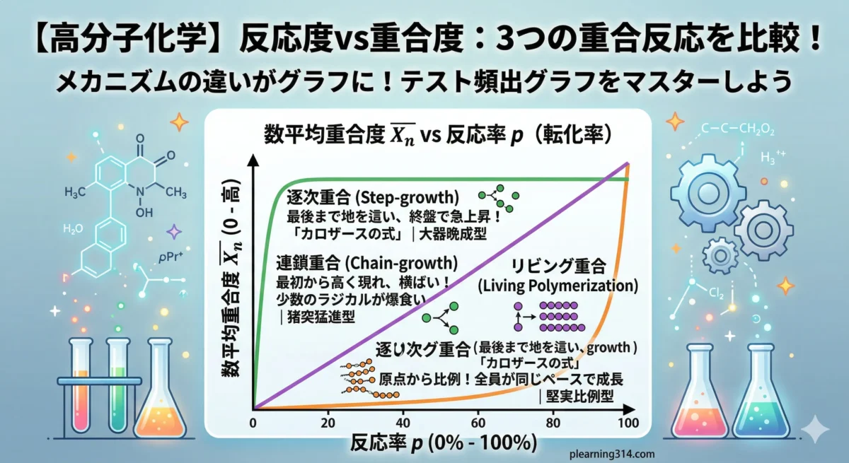 今回は、これら3つの重合方法のメカニズムの違いを「一つのグラフ」で一気に総復習します! テーマは「反応率(p)に対する数平均重合度($\overline{X_n}$)の依存性」です。