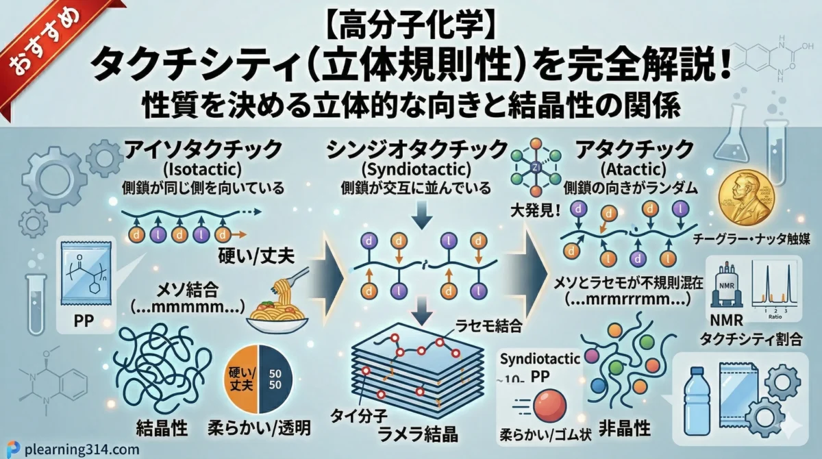- 物性への影響: 向きが揃っている(アイソ・シンジオ)と結晶になりやすく硬い。バラバラ(アタクチック)だと結晶になれず柔らかい。