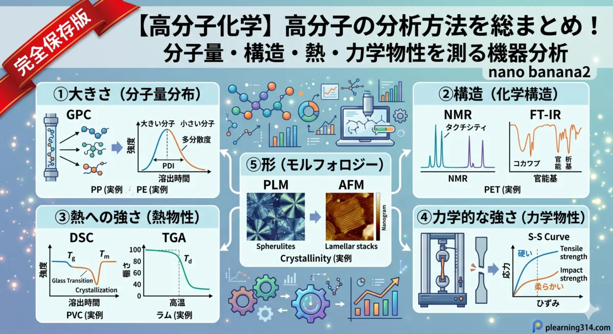 今回は、高分子の正体を暴くための強力な武器である「高分子の主な分析方法(機器分析)」を、測定する目的別にわかりやすく総まとめします!