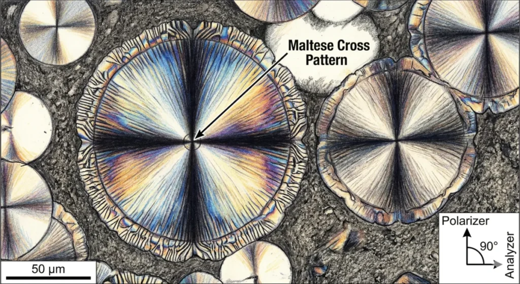 - 球晶(マクロの世界): ラメラが核から放射状に成長し、マルテーゼクロスの模様を持つ美しい球状の集合体を作る。