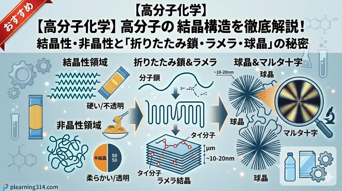 これまで、高分子(ポリマー)が「どうやって作られるか(重合)」について解説してきました。今回は視点を変えて、「できあがった高分子は、固まったときにどんな構造をしているのか?」という、物理的な性質(物性)に直結する「結晶構造」について解説します。