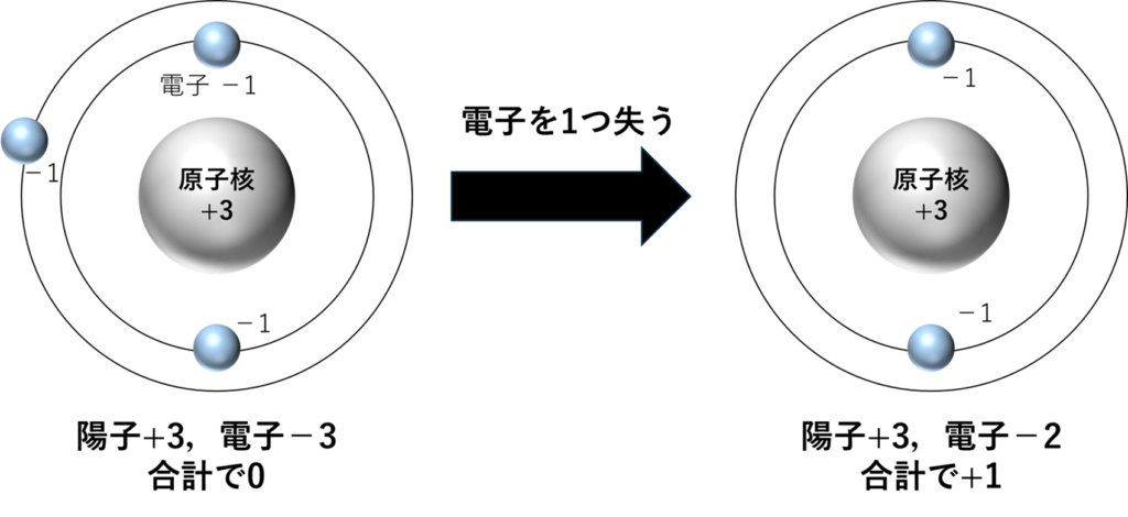 陽子が+1,電子が-1の電気を持つと考えると,元々はリチウム原子全体で0の電気を持っています.しかし,電子を1つ失いイオンになると全体で+1の電気を持つことになります.ですので生じたリチウムイオンは1価の陽イオンと呼び,Li+と書きます.ここで,価とは受け取ったり,失ったりした電子の数のことで価数と呼ばれます.