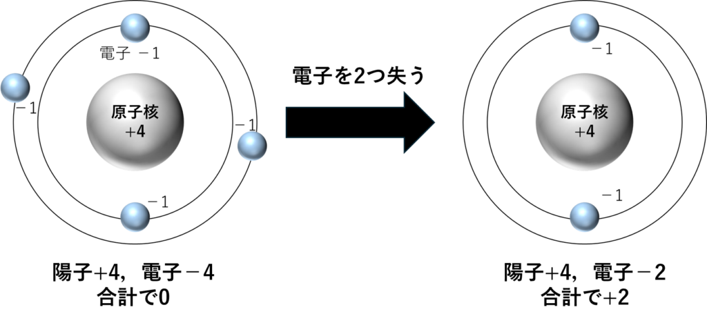 今度は,ベリリウム原子が全体で合計0の電気を持っていたところ,2つの電子を失ったことで+2になりました.そのため,ベリリウムイオンは2価の陽イオンと呼び,Be2+と書きます.