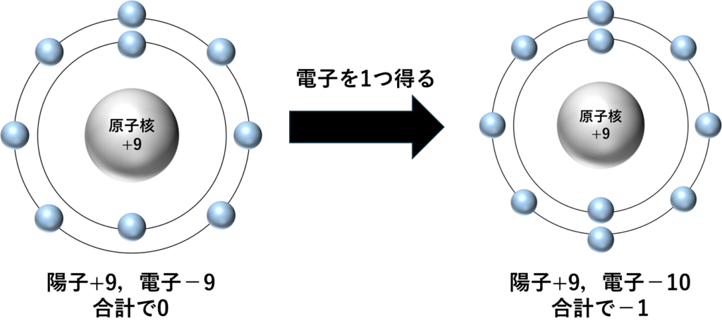 フッ素原子が全体で合計0の電気を持っていたところ,1つの電子を得たことで-1になりました.そのため,フッ素イオンは1価の陰イオンと呼び,F–と書きます.