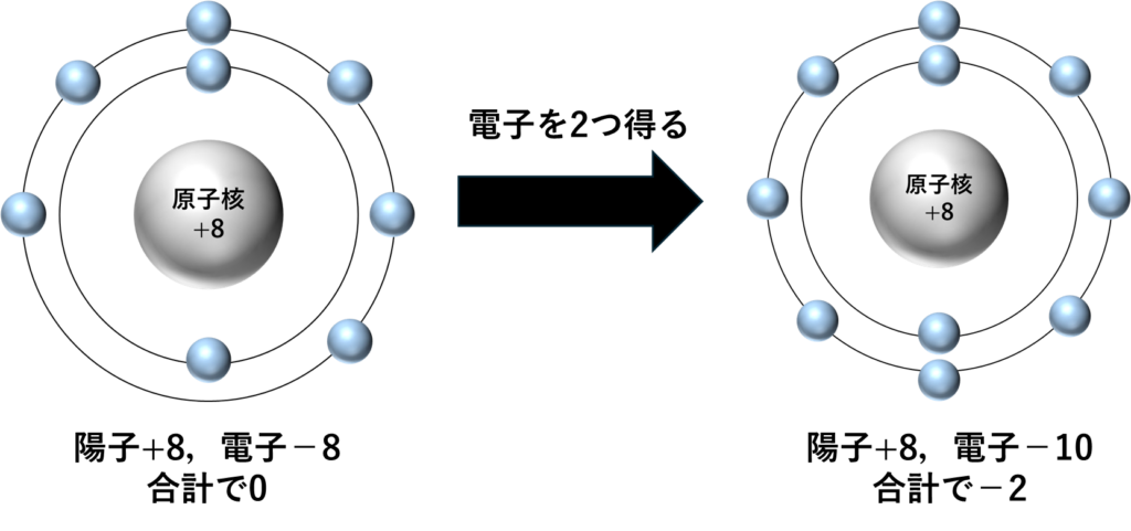 酸素の場合はもともと合計で0の電気を持っていたところ,2つの電子を得たことで-2になりました.そのため,酸素イオンは2価の陰イオンと呼び,O2-と書きます.