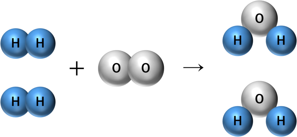 例えば水素と酸素から水ができる反応を考えてみます.この化学反応式は次のように表されます.